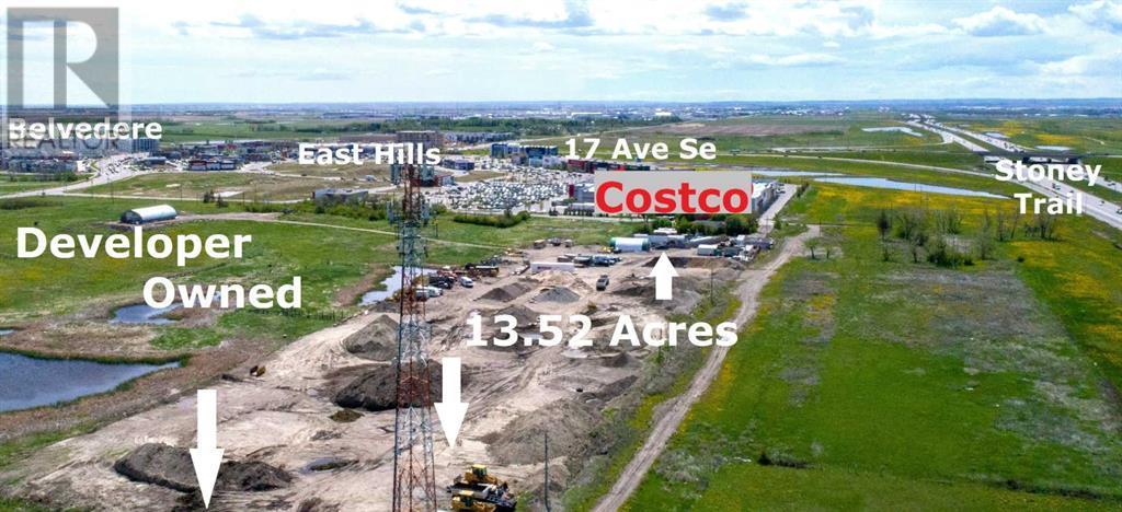 This prime piece of land is centrally located immediately north of East Hills Costco and the RioCan East Hills Shopping Centre and immediately adjacent to new development proposal (133 acres). Lots of growth underway in Belvedere with TriStar Communities Belvedere Rise and Minto East Hills residential neighborhoods well underway, Genesis Huxley community coming soon, and the Memorial Drive Extension Functional Planning Study is in full swing. 13.52 Acres at $750,00/acre (12.26 acres with adjoining 1.26 acres) in Belvedere ASP with 2,000+ foot frontage to busy Stoney Trail Freeway. Services are nearby. Transit to downtown via Calgary Transit's MAX Purple rapid transit bus route service at East Hills Retail (across street from subject land). This 13.52 acre property is immediately north of the RioCan East Hills Calgary retail development which is located at 17th Avenue SE and Stoney Trail and includes major retailers Costco, Walmart, Cineplex, Marshalls, PetSmart, Michaels, Staples and many others under construction. The 13.52 acre property is currently S-FUD. Primarily Land Value (modular home has structural issues). Excellent elevated panoramic south and west mountain and city views. Tenant occupied with cell tower and tenant income, access by appointment only. (id:6289)