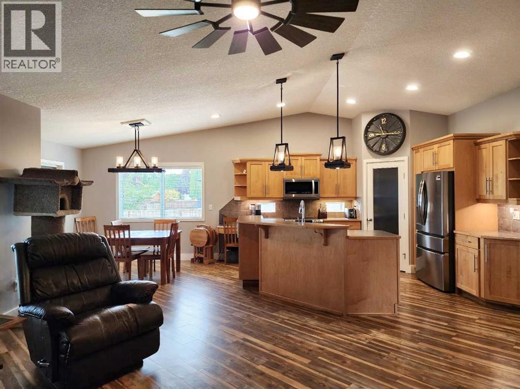 Welcome to this extraordinary executive home, ideally located directly across from the Claresholm Golf Course. With 6 spacious bedrooms and 4 bathrooms, this beautifully updated residence offers the perfect blend of luxury, functionality, and breathtaking views.From the moment you enter, you'll be greeted by a warm and welcoming foyer, highlighted by a striking wood-and-metal staircase railing leading to the lower level. The heart of the home is a chef-inspired kitchen featuring modern fixtures, a stylish tile backsplash, a large island with seating, refreshed appliances (2018), pot lighting, and a convenient garburator. A unique peek-a-boo window under the cabinets brings in natural light and adds to the thoughtful design. The walk-in pantry with wood shelving is located just off the laundry/mudroom, offering the perfect layout for unloading groceries with ease.Thoughtful Layout with Dual Laundry Areas:The main floor laundry room has been recently updated with new cabinetry, a mop sink, and generous storage. A second laundry area in the basement adds extra convenience for larger households or guests.The open-concept dining and living areas are ideal for entertaining or quiet evenings at home. The dining space flows seamlessly onto a large, screened-in, covered deck where you can take in panoramic westward views of the Porcupine Hills and nearby farmland — the perfect setting for sunsets, outdoor dining, or a future hot tub.Spacious Bedrooms & Luxurious Primary Suite:The main level includes 3 bedrooms and 2 bathrooms. The primary suite is a private retreat, complete with a walk-in closet, a 3-piece ensuite featuring double sinks and a custom tile shower, and direct access to the covered deck.Versatile Lower Level for Family or Guests:The fully finished lower level offers 3 more bedrooms and 2 bathrooms. Two of the bedrooms share a cleverly designed 2-piece bath, each with its own private vanity. A large recreation room with soaring 10-foot ceilings provides ample space for a pool table or entertainment setup. In-floor heating throughout the basement adds an extra layer of comfort, along with dedicated mechanical and laundry rooms.Extensive updates completed in 2018 include:New flooring and fixturesFresh interior paintKitchen appliance upgradesMudroom cabinetryThe oversized double attached garage (639 sq. ft.) is a standout feature — fully insulated, drywalled, and equipped with in-floor heat. With two man doors and ample room for storage or workshop space, it’s ideal for hobbyists or car enthusiasts.A Rare Opportunity:This meticulously maintained and thoughtfully designed home is move-in ready and perfect for families, retirees, or anyone looking to enjoy the best of Claresholm living in an unbeatable location. (id:6289)