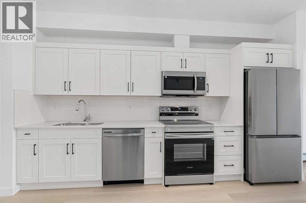 Welcome to your brand new home! This never-lived-in one-bedroom, one-bath condo was just completed in 2025 and is covered by Alberta’s New Home Warranty—up to 10 years for peace of mind, plus a full comprehensive builder warranty for the first year. Enjoy the benefits of a Top floor unit with large windows that flood the space with natural light. The stylish and upgraded LVP flooring runs throughout living and kitchen area, offering a sleek, modern look and easy maintenance. The gorgeous kitchen features granite countertops, ample cabinet space, and thoughtful design—perfect for everyday cooking or entertaining guests. A separate HVAC system for each unit ensures always-fresh air—a rare and valuable feature in condo living. This unit includes one underground titled parking stall and an assigned storage locker for your convenience. Located in an incredibly convenient area—walking distance to a shopping plaza with grocery stores including Walmart and T&T, plus restaurants, shops, the public library, and other essential services. Quick access to Shaganappi Trail and Stoney Trail makes commuting a breeze. Plus, you’re right beside a scenic community green path—perfect for walking, biking, or relaxing outdoors. Don’t miss this opportunity to own a modern, low-maintenance home in a prime location - Book you viewing today! (id:6289)