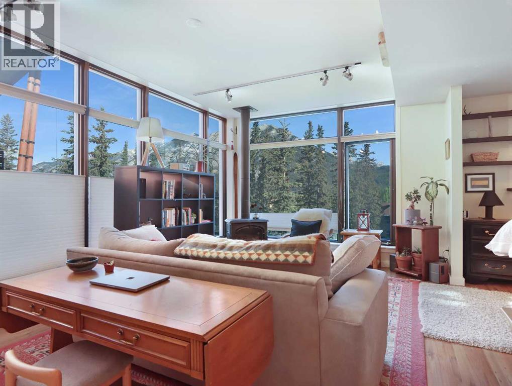 Discover the perfect blend of stunning mountain views & natural light in this exceptional studio, located just minutes from Banff Avenue yet quiet & tranquil. With breathtaking vistas of Cascade Mountain & Mount Norquay, this thoughtfully designed home features two walls of expansive windows, seamlessly connecting the indoor space to its serene surroundings. A slate foyer leads into an inviting living area, where a cozy gas fireplace offers warmth & ambiance. The layout includes space for dining or a home office, alongside a well-appointed kitchen. Step onto the patio to take in more views. Additional features include a full bathroom, in-suite laundry & storage, a huge separate storage room, & underground heated parking. Set within a unique co-operative complex, this residence offers exclusive amenities such as a shared entertainment space with kitchen, a workshop, & a ski/bike tuning room. With the new pedestrian bridge, this prime location is truly one of a kind. (id:6289)