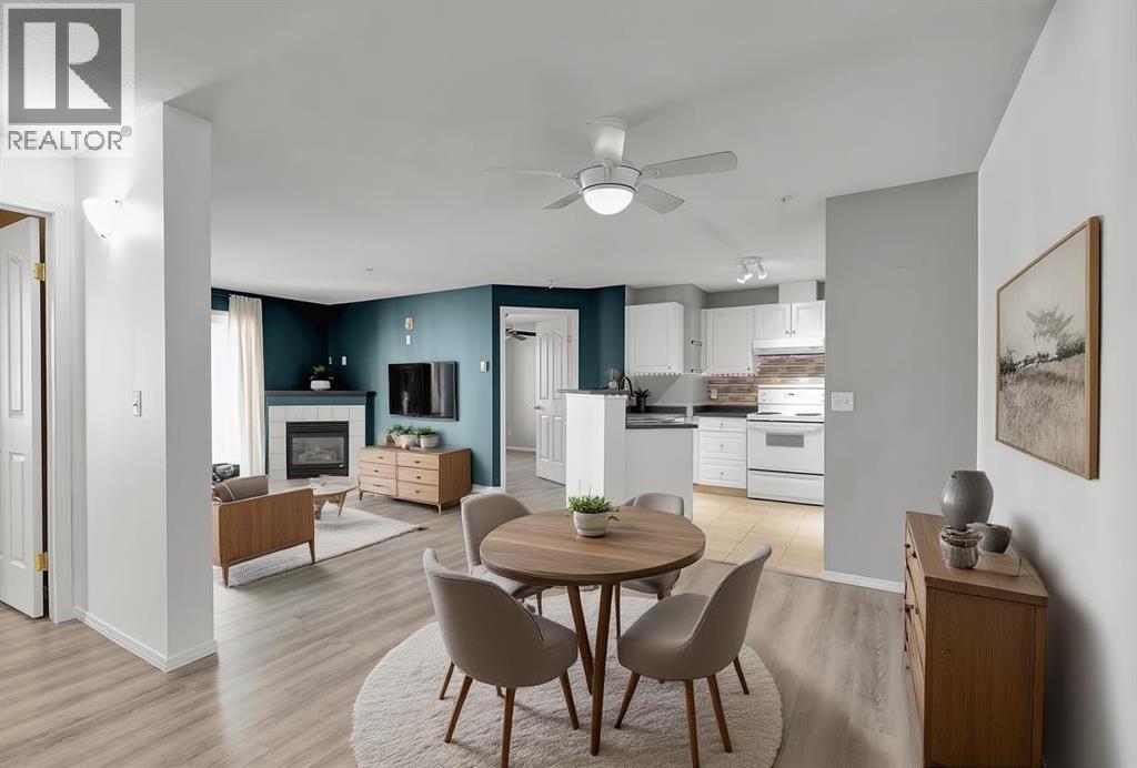 FIRST 6 MONTHS CONDO FEES PAID!! ***OPEN HOUSE*** Sat Oct 4th 11-1pm AND Sun Oct 5th 1-3pm*** Welcome to this well-maintained and thoughtfully updated 2nd-floor condo offering a northeast view overlooking the parking lot—with your assigned stall conveniently located right next to the building! This charming home features a cozy gas fireplace in the living room, perfect for curling up on cool Alberta evenings.Enjoy the peace of mind and energy efficiency of brand new windows and a glass sliding door (2024), along with durable and stylish vinyl plank flooring (2020) that flows throughout the main living areas. The kitchen boasts timeless white cabinetry with striking black countertops, a mosaic tile backsplash, a newer tap, and a Whirlpool dishwasher (2019). A bonus: pull-out cabinet organizers have been added for easy access to your kitchen essentials.The laundry room is a standout feature—not only does it offer ample shelving, but it also includes a full-size high-efficiency washer and dryer (2019)—no small stackables here! The ensuite, main bathroom and kitchen floors were refreshed with modern tile in 2014, both toilets have been upgraded for extra height, and the main bathroom tub has been modified for easy access, complete with a grab bar for extra safety.Additional upgrades include Telus Fibre Optik installed in 2025, ensuring top-tier internet speeds for all your work-from-home or streaming needs.Don’t miss the opportunity to live in a walkable location with everything Airdrie has to offer just steps away.Whether you're a first-time buyer, investor, or downsizer, this unit checks all the boxes! (id:6289)
