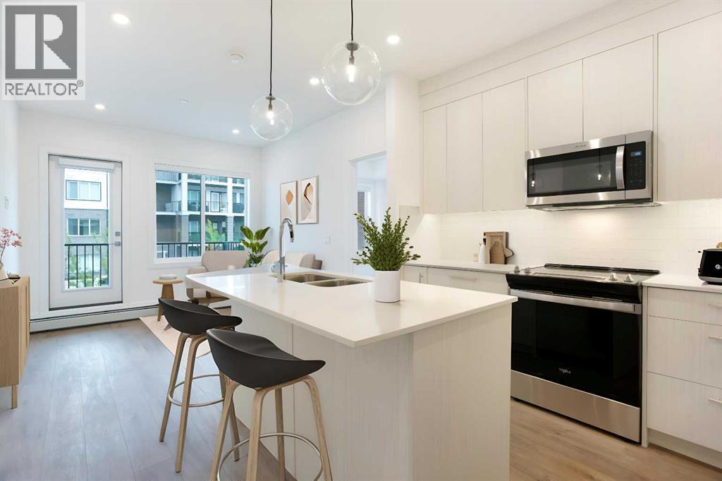 Two Title Parking Stalls | Two Beds + Den | Two Full Bathrooms | Welcome to this beautifully appointed 2-bedroom plus den condo, ideally located on the west edge of Chestermere with an easy commute into Calgary. Designed with a thoughtful open layout, this home features separated bedrooms on opposite sides, providing privacy and functionality.The modern kitchen is a true highlight, showcasing stainless steel appliances, stone countertops, full-height cabinets, pot lights, and a spacious island perfect for both cooking and entertaining. The living area flows seamlessly to a large balcony where you can relax and enjoy the outdoors.Upgraded with luxury vinyl plank flooring throughout, the home combines style and durability. The versatile den adds flexibility, whether you need a home office, guest space, or cozy reading nook.Two full bathrooms complement the well-designed bedrooms, including a comfortable primary ensuite. Practicality meets convenience with two titled parking stalls, making daily life effortless.You'll love the amazing amenities offered at the Lockwood: fitness centre, dog wash, owner's lounge and a secure bike storage room.Perfectly positioned, you’ll appreciate quick access to Costco, East Hills Shopping Centre, and Chestermere Station Shopping Centre. With Chestermere lake being only a quick drive away, you can enjoy summer to its fullest. Whether commuting to Calgary or basking in Chestermere’s local charm, this home offers the best of both worlds. (id:6289)