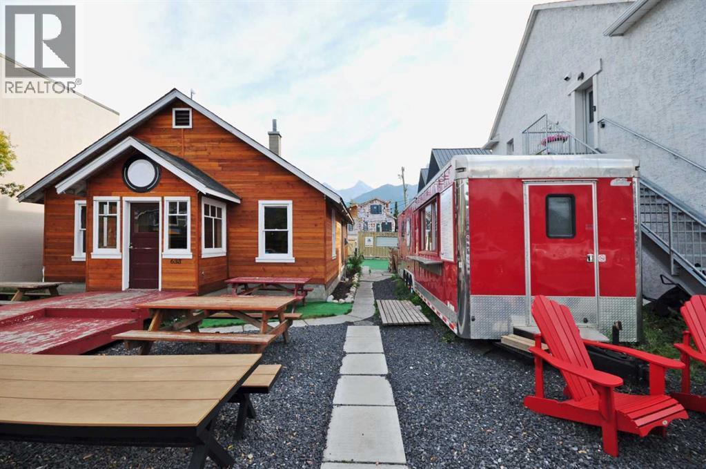 Food truck + yard venue on Main Street Canmore - this offering is for an assignment of leasehold interest and business assets which includes a 32-ft 2014 food truck trailer (converted 2017), yard improvements, and sub-tenant agreement(s). The truck features an amazing, fully loaded commercial kitchen, complete with 8-ft hood, a flat-top grill with oven below, two large gas burners, a six-burner grated grill, two deep fryers with four baskets, plus ample refrigeration, prep, storage, and working space to support a variety of culinary delights and/or artists. Situated on a 6,587sf lot, the outdoor yard is tucked behind the original 915sf, 1910 cabin with both front street and back alley access; set for gathering, dining, and events with two commercial pergolas, a stage, and multiple seating areas. The yard offers a seasonal multi-pad layout for the food truck, one existing sea can sub-tenant (confirmed and wanting to stay), and (un-tenanted) second sea can operating as a licensed bar could be included.The original 1910 cabin is currently zoned for Retail use under the Town Centre land use zoning and provides three new washrooms with access ramp, and yard access. Absolute net lease at $3,220/mo; property taxes approx. $1,000/mo. Leasehold to Dec 31, 2028; assignment subject to landlord approval. Price may be subject to GST. (id:6289)