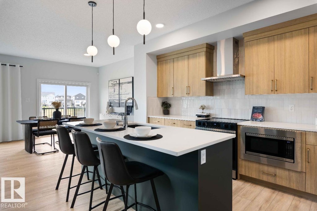 This beautifully upgraded home combines style, function, and an unbeatable location. Situated on a corner lot backing onto a serene pond, it offers both privacy and curb appeal. The main floor includes a rare bedroom with ensuite, ideal for guests, while soaring 9’ ceilings enhance the open, bright feel. The chef-inspired kitchen features stone countertops, upgraded backsplash, pots & pans drawers, and soft-close cabinetry, complemented by an electric fireplace with mantle in the great room. A separate side entrance and basement rough-ins for a bath, laundry, and wet bar provide excellent development potential. Upstairs, a vaulted master retreat boasts a spa-like ensuite with freestanding tub and dual sinks. Additional highlights include a 2’ garage extension, poplar railing with metal spindles, and 9’ foundation walls. Complete with appliance allowance, this home is a true standout. (id:6289)