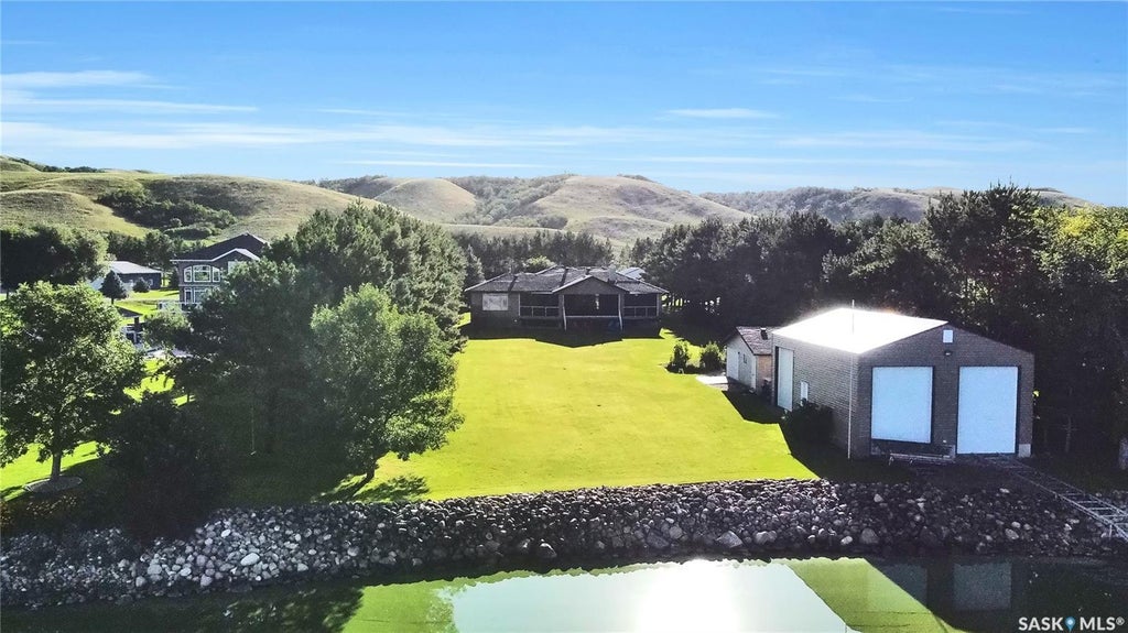 Located at Buffalo Pound Lake's North Shore Estates is the Custom-Built Waterfront Estate. Situated on three stunning parcels, this home boasts over 4100 square feet of finished living space, exquisite furnishings, and extra conveniences you will not want to live without. The stunning grounds, street appeal, and drive welcome you to the prestigious North Shore. With its tile and hardwood floors, the foyer welcomes you into the open-concept living, dining, and kitchen spaces, which are only complemented by breathtaking windows that overlook the rolling hills and lake. Off the dining room are patio doors leading to a covered deck that can be enjoyed on any day thanks to remote-controlled retractable screens! This terrace features a built-in hot tub in addition to seating for dining and informal relaxing. Beautiful cabinetry, granite countertops, a backsplash, a corner pantry, and more space for a coffee station and other storage are all features of the well-appointed kitchen. Direct entrance to the Triple Att. Heated Garage with a polished floor is also available from the main floor laundry, which has a sink, counter, and cupboards. There are two bedrooms and two and a half bathrooms on the main floor, with the primary bedroom featuring five bathrooms, including a deep soaker tub and patio doors to the deck and hot tub. The extra family room with windows and views on the main floor is a bonus. Fully finished, lower level, with two bedrooms, two bathrooms, a den, storage, and a utility room with high-end HVAC systems. In addition to the BONUS of a Double. Det. Garage & a BOAT HOUSE with three overhead doors to store your boat, toys, etc., the well-kept lake lots are approximately 327 feet deep to the water's edge, where you may enjoy a campfire area on a stamped concrete pad. The Boat House also features the convenience of electronic boat rails on a remote to come in/out of the water.