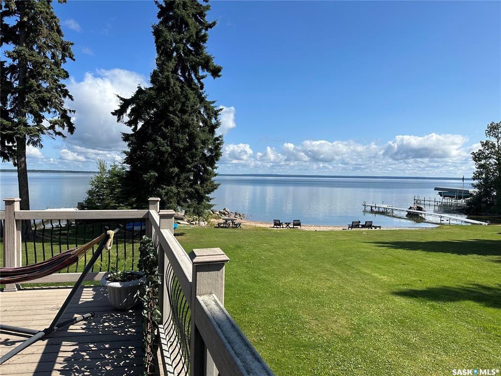 Located in Clearsand Subdivision on West Side of Candle Lake, this is were you want your LAKEFRONT! This well maintained, turn-key property offers 1,248sqft of thoughtfully designed living space. Vaulted ceilings and a charming loft enhance the home's open-concept layout, while oversized windows perfectly frame the stunning panoramic water views. The main floor features 2 bedrooms, a welcoming kitchen with a convenient pantry, and a recently updated 4-piece bathroom. Upstairs, the cozy loft provides two additional beds with a charming view of the main living area, creating a relaxing and functional space for family and guests. Step outside to the expansive composite wrap-around deck, where you can unwind or entertain while soaking in unparalleled water views, lush park-like grounds, and direct access to a gorgeous sandy beach just steps away. For extra accommodation, there's a charming electrified bunkhouse equipped with two bunk beds-perfect for hosting family and friends. Other notable upgrades include:Wonderful Outdoor space, prime marina spot, 200amp service, Stone natural gas fireplace, IC foundation with full slab crawl space, Central Air, Well and septic system with water softeners Triple-pane windows, Large Composite wrap-around deck, Natural gas BBQ hookup, all with tons of storage. Whether you're looking for a serene getaway or an adventure-filled escape, this lakefront home offers the perfect balance of relaxation and recreation. This could be #yourhappyplace
