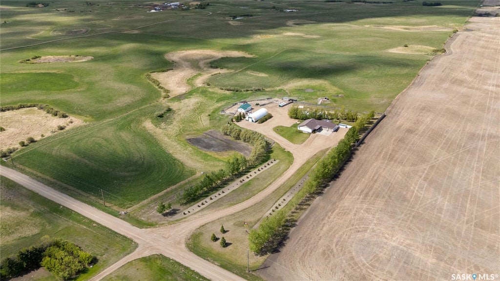 Approximately 50 km from Regina city limits is where you will find this awesome property of approx 20 acres, well established shelter belt, garden area and variety of fruit trees.  Excellent 2007 built bungalow with a great walk out basement. Features Include, large front entry, very open floor plan. Large south facing windows overlooking the yard. Kitchen has ample cabinet space and corner pantry, Primary bedroom on the main floor with 5 piece ensuite, and also on the main floor is the laundry and 1/2 bath.  In the bright walk-out basement is the family room with gas fireplace, den/office, 2 large bedrooms, 4 piece bath and mechanical area. Direct entry from the main floor into the 25x40 heated garage which also has the cold room in it and off the back of the garage is the bonus room with wood burning stove. The out buildings include 30x70 Coverall building with chain hoist overhead doors at each end, 24x36 heated shop(propane furnace)insulated with spray foam, 3 additional metal clad sheds(one insulated with spray foam), wood storage shed and garden shed. Utilities to the house; natural gas, power, private well, septic tank with surface pump out current owners use shaw for TV and explore net for internet. Just 10 miles to Southey which offers elementary and high school(bussing from property), grocery, fuel, health centre, RCMP as well as many other services. www.southey.ca