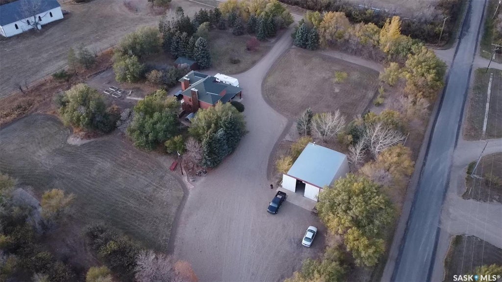 This heritage house and acreage is the largest in Dollard with huge opportunities to reno and modernize or live comfortably as is. The drive way is pull-thru connecting the street and avenue with over 100 mature trees around the perimeter. A 40x40 heated shop on the East side with 240 volt power and 16 foot sliding doors faces the South driveway. The house is positioned across the drive to the NW with a South facing fenced yard, also with mature trees, and a covered veranda wrapping around at the kitchen door. The North side carport provides parking for 2-cars while sheltering the front door. The driveway wraps around past a garden on the West side while also providing direct access to the cellar door. Another shed in the NW corner could be a 1 car garage or used as a super sized garden shed. Inside the house shows some updates in a very livable space. The kitchen includes stainless appliances and the living room has a beautiful brick fireplace. A separate and spacious main floor laundry is the last room behind the main floor full bath. The dining room includes original stenciled glass. Upstairs is the primary bedroom, two medium and on small bedroom. There is a 3pc bath on the second floor. The attic is accessed with a ladder and is insulated with lighting and stand up height making a huge storage space. The second floor also has a North door to a rooftop private patio, great for star gazing. The basement is finished with a rec room, plus cold room storage and mechanical. There have been recent upgrades to both water and electrical systems. The nearby town of Shaunavon has full service fuel, hardware, and grocery as well as schools, library, hospital, and rec center with curling and hockey. There is also the Plaza Movie theatre and summertime community pool. Leave the big city for small town life.
