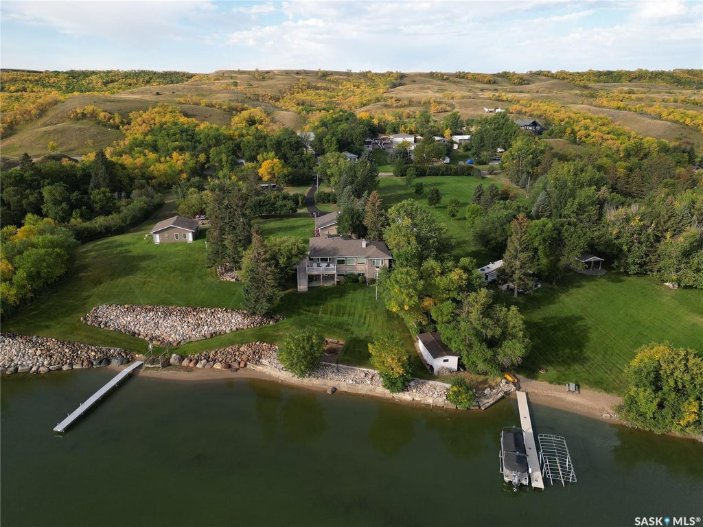ARE YOU THINKING OF RETIRING FROM THE FARM THIS YEAR AND LOOKING FOR A PLACE TO ENJOY THE GRANDKIDS AND PASS DOWN FOR GENERATIONS? Exceptional & PRIVATE walk-out property offers beautiful lakefront living & endless opportunities for relaxation & entertainment. Impressive oversized, fully insulated double detached garage with in-floor heating awaits, perfect for all your vehicles & hobbies. Spacious tiled foyer leads to a gourmet kitchen featuring fine cabinetry, ample counter space, Dbl built-in ovens & convenient pantry. Large eat-up island & bright dining area offer stunning lake views. Easy access to a composite deck, ideal for gatherings. The living room features a stone-accent gas fireplace & beautiful mirage engineered hardwood flooring throughout main areas. Master bedroom boasts a spa-like ensuite with walk-in glass shower, soaker tub & spacious walk-in closet. A cozy built-in bench provides the perfect spot to relax & scenic views. Large office space is easily convertible to a bedroom in this smart layout. Great entertainment space featuring unique heated concrete flooring, spacious bar area with Lg windows & walk-out access to a beautifully landscaped yard. Enjoy many nights in your own private theater with built-in surround sound. 2 additional large bedrooms, abundant storage, including wine & cold storage room, ensure comfort for family & friends. 2 serviced lots with cistern/septic that host a large heated workshop with guest house that could be sold if you wanted if the futures. The property features an irrigation system with over 50 heads, keeping your yard lush. Plenty of room for future swimming pool, pickleball court, or your unique vision. Enjoy your own sand beach with rock accents, perfect for launching your boat or simply soaking up the sun. Beautifully maintained home offers a unique blend of luxury, comfort, & outdoor adventure. An INCREDIBLE & PRIVATE lakefront property!