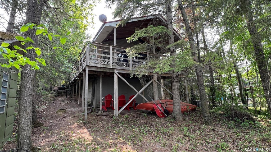 Lakefront Oleksyn Beach, very private heavily treed with spruce and pine trees. 3 bedroom 976sq' Modified mobile home with additions including a metal roof & newer siding. The kitchen features an eating nook, wood cabinets, and an open living dining area complemented by a wood fireplace. Screened sunroom, porch, all appliances (new washer), and furnishings are included with the purchase. Only the seller's personal items will be removed. The front door opens to a large covered deck that wraps around the east side of the cottage. nat.gas BBQ hook-up, plus sheds and a single detached garage on the leased utility lot behind the property until 2034. Also included in the purchase price are a water trailer and a portable 250-gallon water hauling tank, plus an added bonus a 3000lb boat lift with aluminum dock system. 1000-gallon septic tank, 700-gallon cistern. This is an ideal location with great year-round access off Highway 41. The Golf course is just across the lake! Only 50 minutes from Saskatoon.