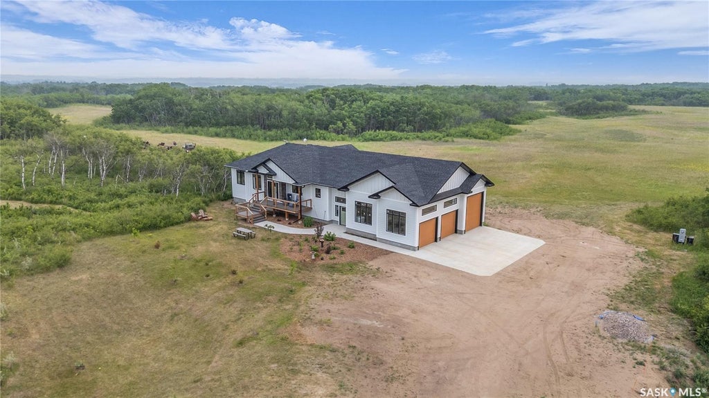 Rare opportunity with this beautiful acreage just minutes south from Saskatoon situated on 69.54 acre’s & located just off Merrill school road right beside Merrill school! This peaceful paradise offers the privacy & tranquility of country living, just 7 minutes to circle drive in Saskatoon, close proximity to the popular Berry Barn, a community center, a rink, a heated ice shack in the winter as well as school bus pickup right at the property to many schools in Saskatoon. This one of a kind 1832 sq.ft raised bungalow, Energy Star Certified home features a triple attached garage & shop! The attached shop has a 12 ft. overhead door with 14 ft ceilings, in floor draining, room for 4 vehicles & a future vehicle lift! The exterior of the home has Hardy plank siding, an 8x22 front deck as well as a concrete walkway/patio area. The home features triple pane windows, insulated concrete floors in the garage & basement, an ICF foundation, 14 inch walls, R50 insulation in the attic & energy efficient utility bills. The main floor is inviting with 11” ceilings, vinyl plank flooring & a stunning kitchen that is open to the dining/living area! The kitchen features a large island, quartz countertops, tile backsplash, black stainless steel appliances, a hood fan that vents directly outside & a butler’s pantry with sink built in. The Great room has a beautiful gas fireplace with brick surround. There is a commercial grade water heater & reverse osmosis system as well as a rough in for a future wet bar. All services were newly set up in 2022; (1000 Gal Septic tank, Septic field, Well - 50 feet & 40 gal per min). The current zoning of the property allows for a large detached shop or Quonset, & this perfect family acreage comes complete with a firepit, a water softener, central air conditioning, central vacuum, natural gas bbq hookup, all appliances & many Saskatoon berry bushes. Subdivision is a possibility in the future & any remaining new home warranty can be transferrable.