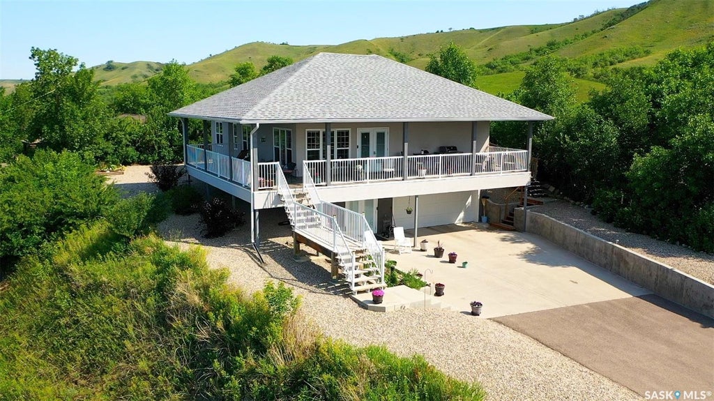 "LAKE life with a VIEW and without WEEDS and all the yard work"...4 bedroom plus 3 bath titled property situated on large corner lot will take your breathe away. Capture the beauty of the Qu'appelle Valley and lakeview from your 2 sided balcony. This 2017 all year round home provides 1665 sq ft on the main floor , has a walk out basement (approx 800 sq ft) with a double heated (in floor heat) (22' x26') garage with direct second level access. From inside this modern and classy bungalow find an open layout dining , living and kitchen that allow you to view the spectacular scenery. The kitchen island will be your favorite work space. There is an induction top , built in oven, large pantry, and many cabinets and counters. 1/2 bath off the side entrance and laundry room which is ideal. Relax in the sitting area with a 3 sided NG fireplace. The one room is currently used as an office but could be your second bedroom on the main floor. Primary bedroom is private and is found at the back (north side) of the home with 2 walk in closets and a huge bathroom with the largest walk in tiles shower. Down to the basement with 9' ceilings, the walk out offers 2 more guest bedrooms, a 4 piece bath, a media room and exercise (flex) area. Access the heated garage on this level and a utility room , great for storage as well. The outdoor area is "Xeriscape" , stunning and easy to maintain. There is a patio area below the balcony with NG hook up for fire table or BBQ and a back entry with stairs to enter the laundry/ mudroom. On the balcony there is 2 NG hookups. Just down the road , a heated single garage in a well treed area is used for keeping the yard equipment and all the "boy toys". This property is TURN KEY and ready for you! Many features to view here ...Must see to appreciate the views and Easy Care lake lifestyle.