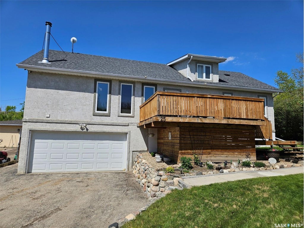 Discover year-round living at 25 Alice Cres in the Resort Village of North Grove, offering fantastic access to Buffalo Pound Lake! This charming 1406 sq/ft home provides 3 bedrooms and 1 bathroom, blending comfort with desirable lake area amenities. The main floor boasts beautiful hardwood flooring throughout most of the living areas and tile in the 4-piece bathroom with main floor laundry. The heart of the home is the oak kitchen, featuring elegant granite countertops, an island for extra prep space, and a full suite of black appliances. Enjoy ample cabinet space and a pleasant view of the north-facing backyard from the kitchen sink. The main floor hosts two comfortable bedrooms, while a private third bedroom and a versatile bonus area await in the loft. Downstairs, the basement, rebuilt in November 2023 including spray foam insulation, offers a large family room and convenient direct access to the 20x23 heated double attached garage, plus a dedicated 15x12 workshop – perfect for hobbies or extra storage. Other updates: Water heater replaced August 2025 Outdoor living is a dream with a large south-facing front deck, plus another deck and a gravel patio with a firepit in the backyard for entertaining. A large water holding tank for hauled potable water includes water softener equipment and a new water pump installed in 2024. A community water line from the lake is available during summer for yard watering. Enjoy easy access to the nearby boat launch and a boat slip dock area (rented at just $50/year). The community offers a fantastic beach and playground, and a school bus service to Moose Jaw adds to the convenience. This is your opportunity to embrace the Buffalo Pound Lake lifestyle!