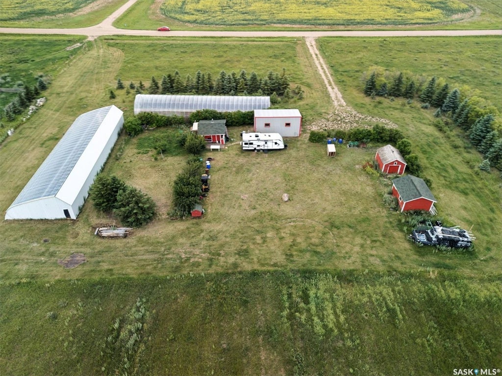 This exceptional 9.8-acre flat agricultural-residential parcel is located just 12 minutes northwest of Saskatoon’s North Costco, offering both immediate utility and long-term investment potential. Situated within the city’s future urban development plan and close to the upcoming Ring Road and arterial expansions, the area has seen rising land values driven by infrastructure growth and regional potash resource potential. The property is set up for the establishment of an Intensive Agriculture-Horticulture operation (with permit and rarely granted approval). It features two greenhouses valued at approximately $100,000 (approximately 6,000 square feet for two combined & professionally designed specifically for Saskatchewan’s climate condition), a 30’ x 16’ x 12’ quonset/shop large enough to house a tractor, and three additional outbuildings for storage. Utilities include electricity already in use, an 85-foot water well, and gas line access is nearby. The land is surrounded by mature windbreak trees, offering privacy and natural protection. Mineral rights are included, with a potential standalone value of $30,000–$50,000+, and pending compensation remains unclaimed. Whether for farming, building, or commercial ventures, this property offers excellent views, strong upside potential, and a rare blend of infrastructure, income opportunity, and development appeal.