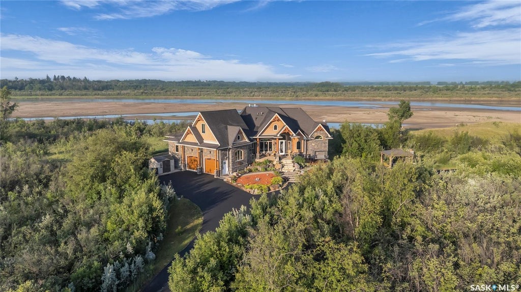 Live the Riverfront Dream. A Truly Exceptional Home. Set on an incredible 32-acre lot with 12 acres of private riverfront, you won’t find another property like this! Offering over 5000 sq ft of living space, the award-winning Durette Acreage makes an unforgettable first impression with its striking roofline and dramatic front elevation. Inside, soaring vaulted ceilings, stone fireplaces, and panoramic river views create a sense and scale with timeless style. While the craftsmanship and natural wood details ground the home bringing a feeling of warmth and intimacy. At the heart of the property is a space designed to bring everyone together: a custom walnut kitchen—seamlessly connecting to the family room and breakfast nook, which opens onto the wraparound balcony (a perfect spot for our Saskatchewan sunsets). The luxurious primary suite is sensational: coved ceilings, river views, spacious walk-in closet, and a spa-inspired ensuite. Upstairs, a private loft suite with full bathroom offering options for bedroom or home office space. Downstairs, the 3 bedroom walkout level with its 9-foot ceilings opens into a large family room and games area, divided by a beautiful gas fireplace. A home theatre room is for the kids and the custom built wine room is perfect for wine lovers or collectors. Step outside into the acreage lifestyle of your dreams. You’ll find a handcrafted gazebo with a wood-burning fireplace. Peaceful corners for morning coffee. A lower patio designed for late-night s’mores and unforgettable family moments. Bold. Luxurious. One-of-a-kind. This isn’t just a house , it’s the place you’ll build a lifetime of priceless memories with your family.