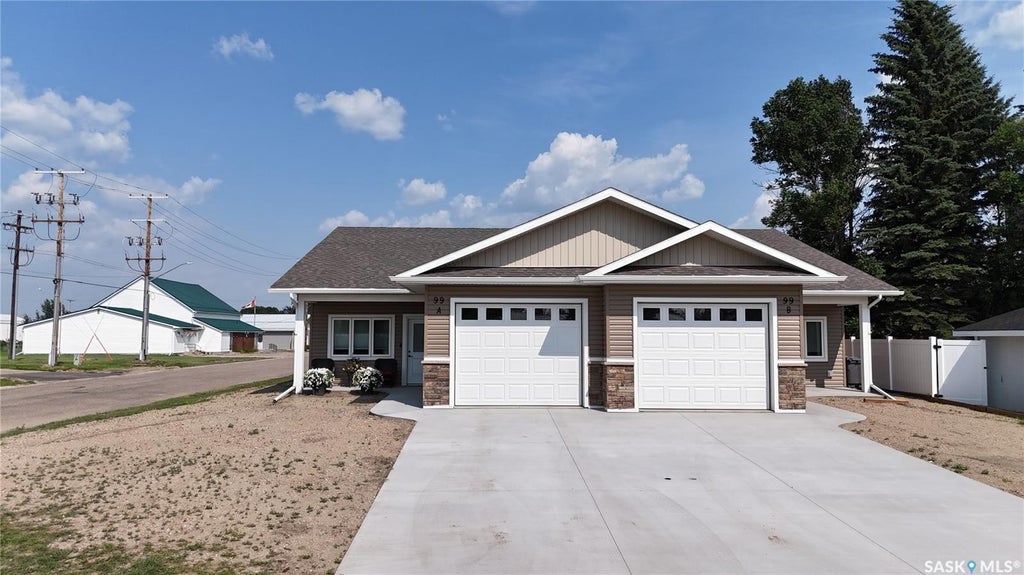 MODERN 1/2 DUPLEX Living Near the River - 99A Semple St, Outlook, SK. Step into easy, contemporary living in this 1297 sq ft 1/2 duplex home built in 2024, ideally located just minutes' walk from the scenic South Saskatchewan River and Outlook Regional Park, downtown and seniors complex. Thoughtfully designed with comfort and functionality in mind, this 2-bedroom, 2-bathroom home is perfect for seniors or anyone seeking single-level living with ZERO STAIRS. Enjoy 9-FOOT CEILINGS, durable vinyl plank flooring throughout, and an OPEN- CONCEPT layout featuring a spacious kitchen with CUSTOM CABINETRY and abundant counter space that doubles as an island seating 4-6. The large primary bedroom includes a generous closet and a PRIVATE 3-PC ENSUITE. You'll appreciate the convenience of ON DEMAND HOT WATER HEATER, a laundry room with extra space for storage or a home gym, and a FINISHED CRAWL SPACE with a concrete floor, ideal for seasonal storage. The EAST-FACING BACK PATIO offers a private spot to enjoy your morning coffee, while the FENCED BACKYARD and FRONT PATIO SPACE offer room for relaxation or future landscaping. Additional highlights include a single-car attached garage, concrete driveway, and fenced backyard. Front and rear yards are ready for your personal touch, with lawn installation left to the new owner. Don't miss your chance to own a LOW-MAINTENANCE, MOVE-IN READY HOME in a quiet, riverside community.