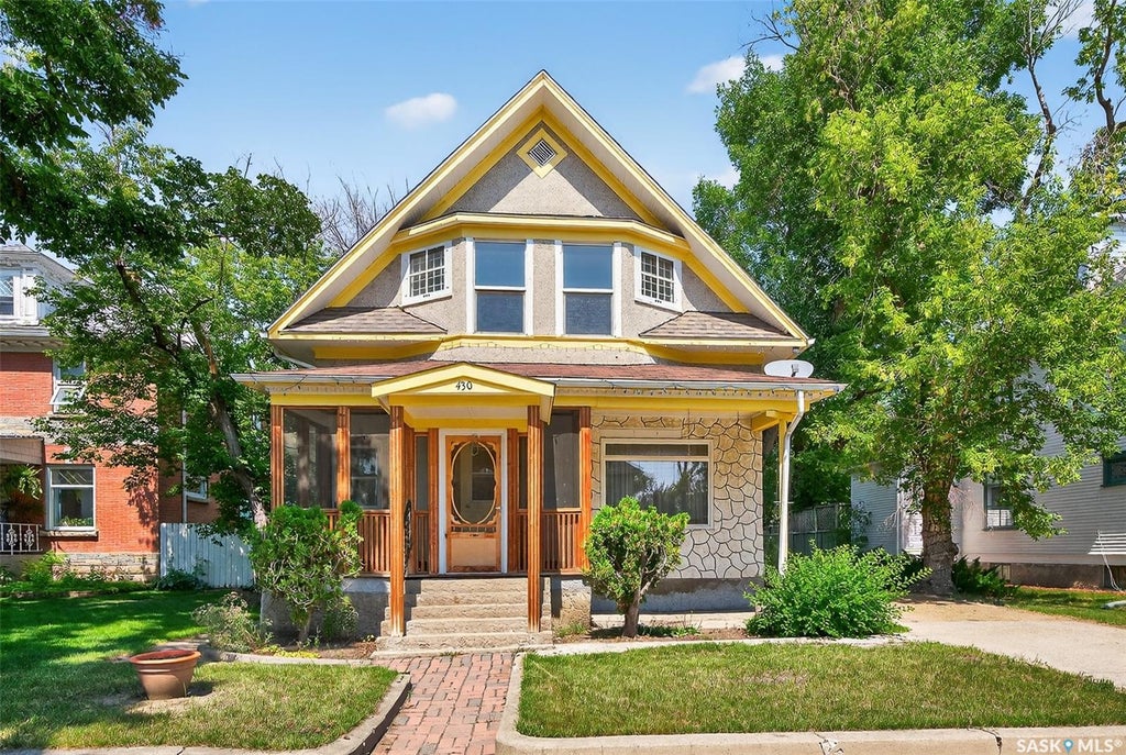 Charming Character Home in the Heart of Moose Jaw! Welcome to 430 Ominica Street W. – a truly unique, Character-filled home offering timeless charm with thoughtful updates. Built in 1910, this one-of-a-kind property blends vintage warmth with modern functionality, perfect for a growing family or anyone who loves classic architecture. Step inside through the screened-in porch and be greeted by original wood doors, leaded glass accent windows, and beautiful French doors leading into the formal dining room. The living room showcases a brick wood-burning fireplace, crown moulding, making it the perfect gathering place. Adjacent is a cozy family room addition (which could make a 5th bedroom if needed) featuring deck doors and laminate flooring that opens to a private two-tiered deck and partially fenced backyard.