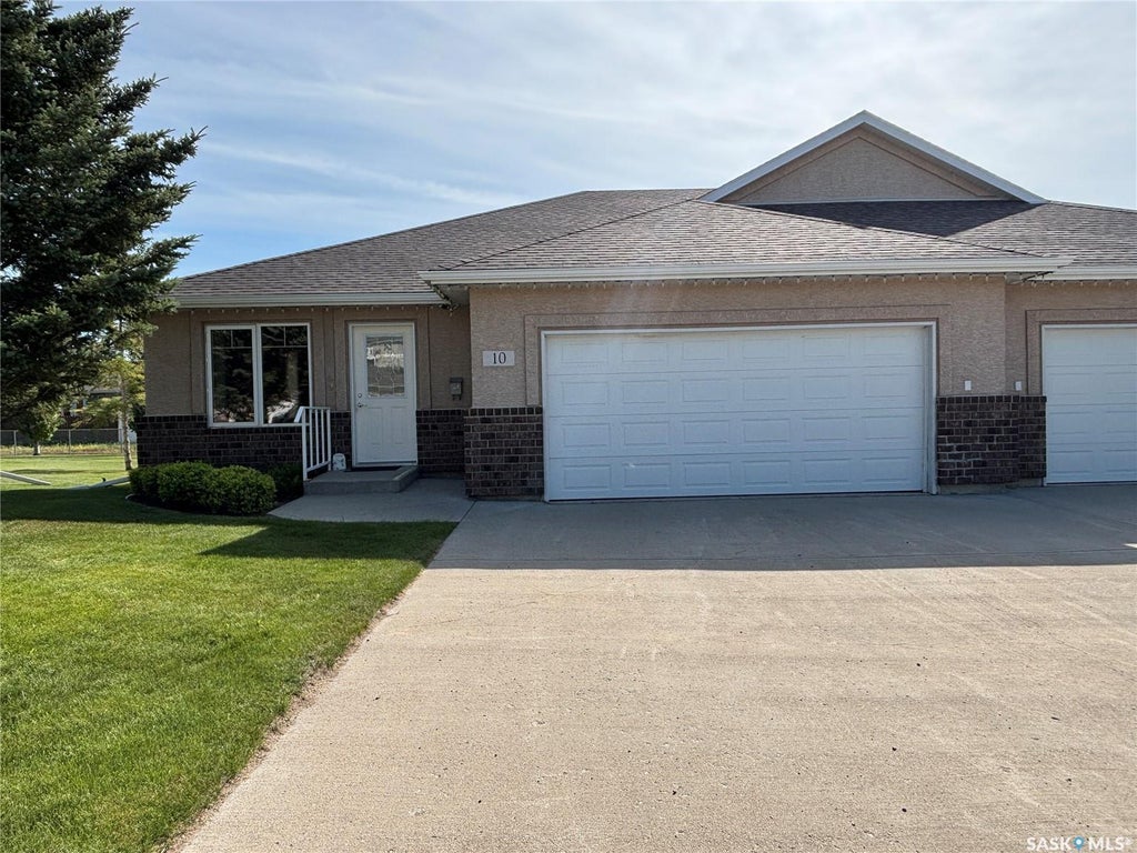 Welcome to 10 Stevenson Court, located in the Rosedale subdivision of Kindersley. This 1296 sq ft property is perfect for retirees, snowbirds, or anyone looking for a low-maintenance lifestyle. The front entrance opens into a spacious family room, which seamlessly flows into the kitchen and dining area, creating an inviting open-concept design. You'll appreciate the abundant natural light from the many bright windows throughout the main floor. Off the kitchen, you'll find a lovely deck complete with an electric awning, beautiful shrubs, and a shade-providing tree. The main floor also features an office, a primary bedroom with a large walk-in closet and an accessible four-piece en-suite bathroom, and another three-piece bathroom. A convenient mudroom with laundry and a utility sink is located directly off the double attached, fully insulated garage. The fully finished basement offers two large bedrooms, a four-piece bathroom, and a utility room equipped with a sump pump, furnace, water heater, and air exchanger. This level also includes a large family room with a bar, perfect for entertaining, and a spacious storage room. All appliances are included in the purchase price. Call today to schedule a private showing!