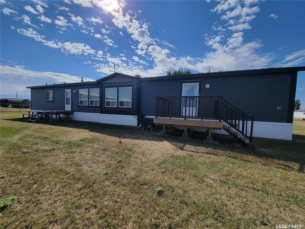 Welcome to 5123 Mirror Drive, Macklin, SK This 1,216 sq. ft. 2015 SRI Shelter-built home sits on an owned lot and offers a bright, functional layout. The main entry from the deck opens into a foyer leading to the open-concept kitchen, dining, and living room with vaulted ceilings, ample cabinetry, generous counter space, and stainless steel appliances. The primary suite includes a walk-in closet and 5-piece ensuite with deep soaker tub. A separate laundry room with secondary entry adds convenience. Two additional bedrooms and a 4-piece bath are located on the opposite end of the home. Inclusions: fridge, stove, dishwasher, microwave range hood.