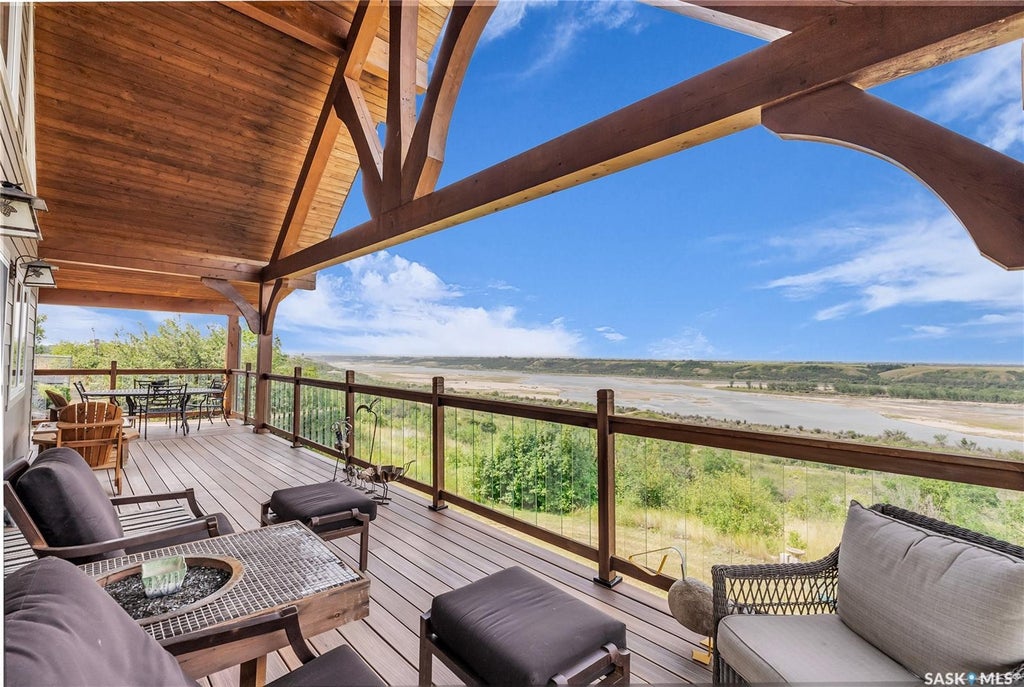 Year round sanctuary AWAITS! This stunning location of almost 5km panoramic view of the River will indeed captivate you! Inside, the interior reflects a charm and elegance. Vaulted ceilings with exposed beams, tree trunks for posts are like no other home you have seen before! A stone gas fireplace stands as the centerpiece of the main floor living space with another stove on the other side, radiating warmth and inviting cozy gatherings. The rustic style carries throughout with the light fixtures, unique vanities and imported medieval times inspired doors that greet you! The kitchen, a culinary haven, boasts handcrafted cabinetry and granite countertops, offering both functionality and style. Adjoining the dining area, it sets the stage for memorable meals shared with loved ones against the backdrop of the river. Ascending the staircase, one discovers a sanctuary of rest and relaxation in the primary bedroom suite. The primary bedroom loft allows for a bird’s eye view of the surroundings in & out! Step downstairs and as you enter, you'll be greeted by the inviting gas fireplace, perfect for cozy gatherings while watching the sun set. Adjacent to the fireplace is the built-in wet bar area, ideal for entertaining guests. The walkout feature leads directly to a the enclosed hot tub structure that keeps the wind and elements away year round! The heated attached 3 car garage (28x40) is a huge asset as it combines functionality with convenience with its workshop area and vehicle storage. The yard beckons exploration, with meandering pathways leading to secluded areas for self reflection with nature. Whether basking in the warmth of the sun or reveling in the serenity of starlit nights, every moment spent in this idyllic retreat will feel like such a unique place to be! Come for your own tour and see what this hillside home offers along with its unobstructed sight lines of the South Saskatchewan River! We have a video tour available!