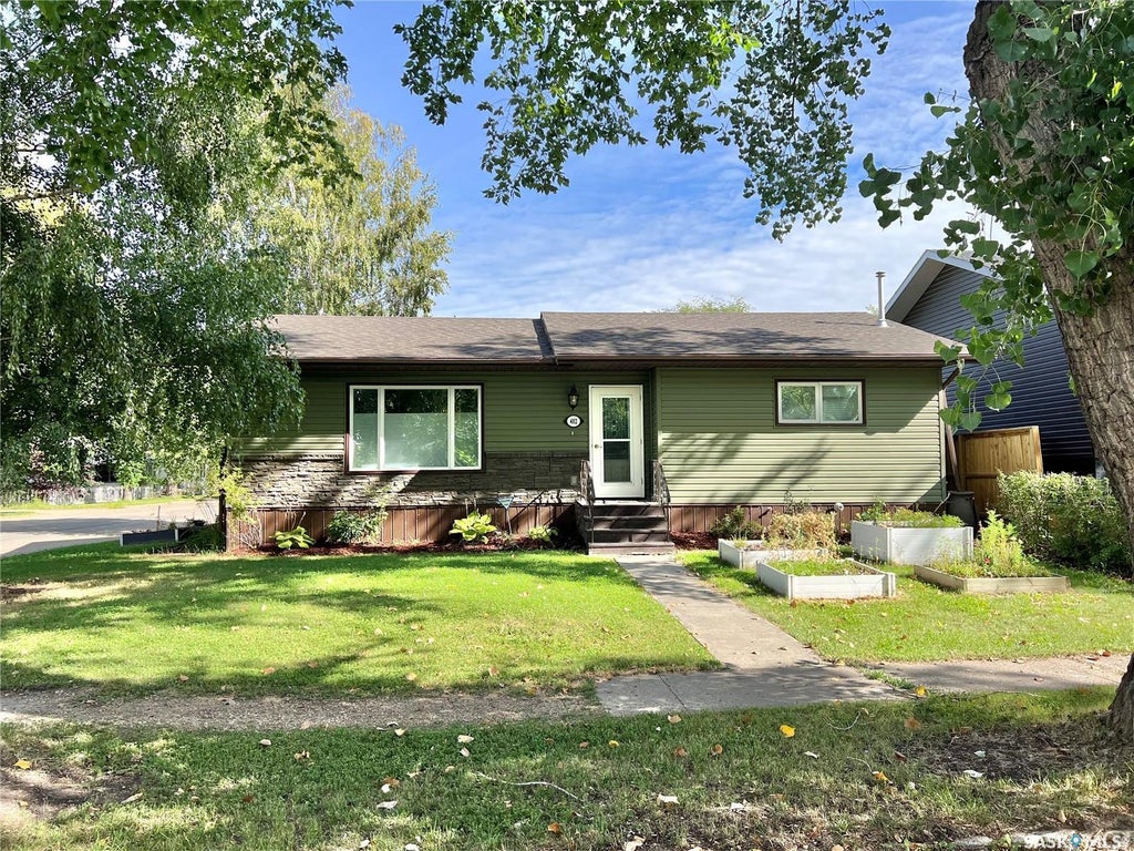 Located on a corner lot, this property features a 1210 sq.ft. bungalow with a double detached garage (26'x22). The foundation was built 1994 and the bungalow was built 1983 and moved onto foundation. The garage was built 1994. Entering the rear of home, you have a spacious entry that leads you to main floor laundry room shared with a two piece bath. The kitchen and eat in dining provides ample cabinet and prep area with counter tops and sink/faucets recently replaced. Kitchen includes fridge, stove, bi dishwasher, microwave/fan. The living room is large, creating room to stretch out and relax! There are two spacious bedrooms on the main floor along with a full bath. The basement is finished with a large rec room, 2 dens, three piece bathrooms and storage room. Exterior of home was renovated with windows being replaced in 2008, exterior siding, rock imitation and doors in 2013, shingles on house and garage in 2014 and fence in 2018. Other notable features include: central air, washer/dryer, sauna, air exchanger (replaced 2021) and water heater (replaced approx 2023). Owners had home landscaped around the grading of foundation with mulch. The home has thick exterior walls that create an efficient home with Sk Energy monthly payments being $55/month