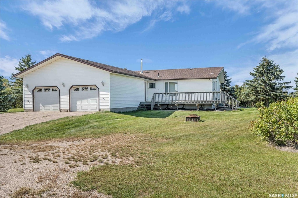 10 Acre Acreage with Spacious Bungalow & Outbuildings. This 10-acre property offers the perfect blend of prairie views, mature trees, and a well-kept home with plenty of space for the whole family. The 1,600 sq. ft. bungalow was originally built in 1970 and moved onto a new basement in 1998, giving it a solid foundation and great potential for further development. Inside, you’ll find a bright and functional floor plan. The spacious entryway includes a convenient 2-piece bathroom and laundry area just steps from the door. The kitchen and dining area are well-appointed and flow into a huge living room perfect for family gatherings. Three bedrooms and a full bathroom complete the main floor, along with excellent storage throughout. The basement is boarded and ready for finishing, with plenty of space to add bedrooms or a rec room. A completed 4-piece bathroom is already in place, making it easy to customize the lower level to your needs. Additional features include an oversized double attached garage, well water, and natural gas service. The yard site is well-equipped with a 38’ x 40’ Quonset (with overhead door and water), a spacious shed with hydrant, and room to enjoy both treed areas, spacious deck, and open prairie views. Located central to Bruno, Viscount, and Humboldt, and less than an hour to Saskatoon, this acreage offers the best of both privacy and accessibility. The yard is currently in the process of subdivision, with completion set for January.