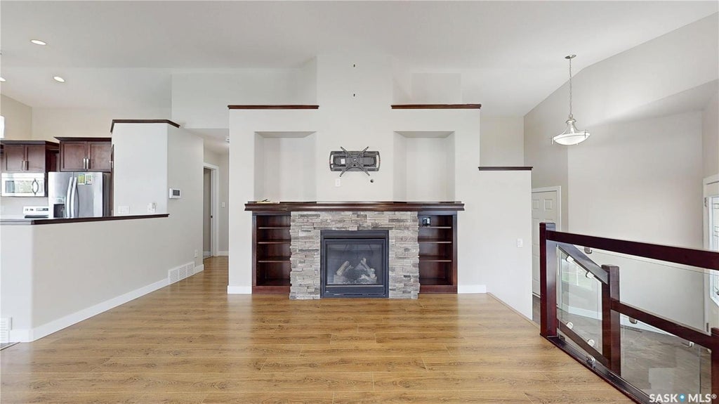 Brand new listing for a Harbour Landing Gem! Welcome to this beautiful bi-level built on piles tucked away on a quiet bay with amazing neighbours — and sitting on one of the biggest lots in the area! Seriously, a riding tractor could be justified. Step inside to an open concept layout with a sleek glass panel rail to the basement, keeping that bright, airy vibe flowing. The spacious kitchen + dining area is perfect for gatherings or entertaining for the next rider game or upcoming holiday season. The primary bedroom will easily hold a king size bed and has a 3 piece ensuite, there is a second bedroom and the main bath makes this main floor area feel spacious. Downstairs is ready for both fun and function — featuring built-ins for the ultimate theatre room, three large bedrooms, a 4 piece bathroom and lots of storage! This basement is super functional and has been well laid out to meet all your family needs. Outside, in your massive back yard you will enjoy a partially covered deck, fully fenced yard, and a gravel base pad ready for an above-ground pool or it would make a great set up for a cozy fire pit night. Add in the oversized double attached garage, and this move-in ready home has it all. Harbour Landing living at its best — space, style & community. Contact your realtor to see if this might be your new home.