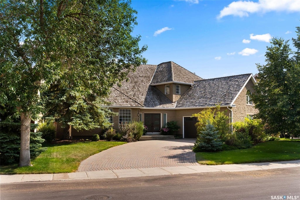 Don’t miss this elegant and spacious two-storey home in prestigious Wascana View! This stunning custom-built property offers 5 bedrooms plus a large bonus room, with an exceptional floor plan and numerous upgrades. A brick façade, offset double attached garage & lush landscaping create impressive curb appeal. Inside, a sunken foyer with granite tile sets the tone. Formal living and dining rooms feature vaulted ceilings and large picture windows, filling the space with natural light. Sleek kitchen showcases Italian cabinetry, granite countertops, pot lighting, a two-tiered island with 5-burner gas cooktop and pop-up fan, built-in KitchenAid oven, built-in Panasonic microwave, and newer dishwasher (2019). Composite stairs lead to the outdoor patio, while the adjacent family room highlights a stacked-stone fireplace and media area. Custom mudroom/laundry is complete with stacking washer/dryer & built-in lockers.2-pc powder room with stylish finishes completes the main floor. The heated, boarded garage offers two direct entries to the home, including one that leads directly to the basement. Upstairs, the bonus room with gas fireplace provides flexibility as a cozy retreat or additional bedroom. The luxurious primary suite includes a spa-inspired ensuite with steam shower, double vanity, new window, and dressing area, plus a custom ClutterX walk-in closet. Two additional bedrooms and a fully renovated 4-pc bath with ceramic tile and granite vanity complete the level. Developed lower level features a large rec room, two more bedrooms and a stylish updated 4-pc bath. A hidden bookcase door reveals a secret craft room. Backyard is an entertainer’s paradise with a spacious stone patio and bar area surrounded by mature landscaping. Additional upgrades include new flooring throughout most of the home, smart lighting with Lutron dimmer system, EcoBee thermostat, security system with cameras, and Telus monitors. Luxury living in one of Regina’s most desirable neighbourhoods!