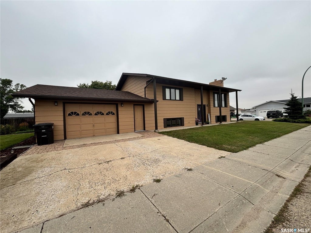 Welcome to this well-maintained bi-level home located in the growing community of Lanigan, Saskatchewan. Nestled on a quiet crescent, this property sits on a desirable corner lot within walking distance to schools and parks—an ideal spot for families. The exterior boasts attractive street appeal with a single attached garage, surrounding green space, a small garden area, and a three-tier deck at the back—perfect for entertaining or enjoying the outdoors. Inside, you’re greeted with a spacious entrance that offers the option to go up or downstairs. The main level features a bright living room with large windows, flowing seamlessly into the dining room and kitchen. The kitchen provides plenty of counter and cupboard space with classic oak cabinetry, along with a convenient storage closet off the rear entry—large enough to house a stand-up freezer. Two generously sized bedrooms and a four-piece bath complete the main floor. The primary bedroom includes a unique makeup area that could easily be converted back into a two-piece ensuite for added convenience. A handy laundry chute connects the main bath directly to the basement laundry area. The lower level is designed for comfortable living with large windows that bring in natural light, a spacious family room with a cozy wood-burning fireplace, two additional bedrooms, a three-piece bath, and a laundry/utility room with ample storage. With a thoughtful layout, plenty of storage, and a welcoming neighborhood, this home offers comfort and functionality for a growing family.