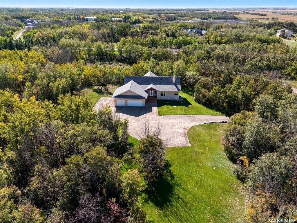 This home welcomes you with an abundance of natural light, grand tall ceilings, cozy gas fireplace, and the serenity and privacy that the beautiful natural treed yard provides. Enjoy your morning coffee off the East and South facing balcony off of the dining area. The kitchen provides ample storage with two-tier island, new fridge and dishwasher, and a walkthrough pantry providing easy access and even more storage between garage and kitchen. Main floor laundry with new stacking washer and dryer. The den off the main entrance has been previously used as a bedroom. Primary bedroom features a walk-in closet and spacious 4-pc ensuite with separate walk-in shower and corner jet tub. Large basement family room with wet bar, walkout to an expansive brick patio, in-floor heat, 2 large bedrooms with walk-in closets, 4-pc bathroom, and ample storage space in the oversize utility room. Finished three-car garage with central vac and in-floor heat. Water supplied to the property by public water line. The home has been freshly painted throughout and the shingles were replaced in 2023. The hamlet of Discovery Ridge offers many exciting benefits including water testing fee coverage, fibre optic internet, septic pump out every two years, and garbage and recycle pickup right at your property entrance! Great private acreage opportunity just East of Saskatoon with the possibility of a quick possession. Book your showing today!