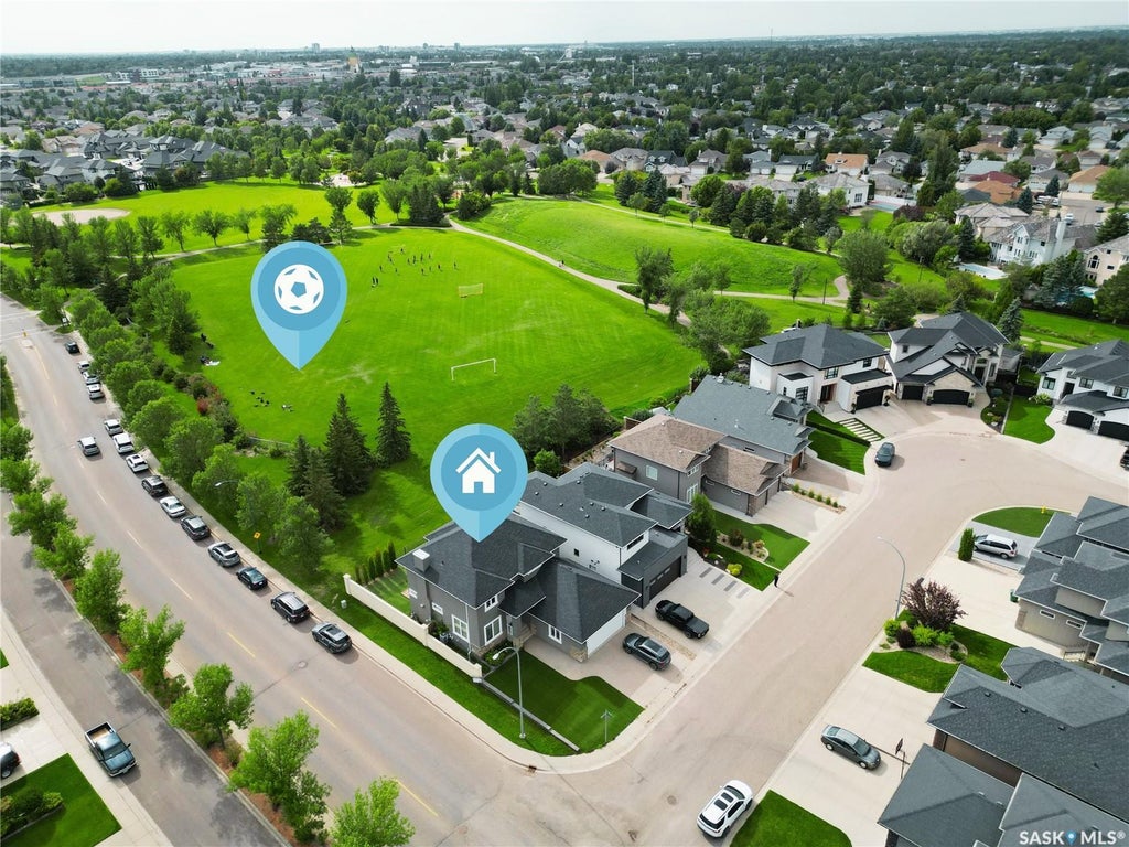 Welcome to this beautifully designed 2,434 sq. ft. two-storey home, custom built by Valentino Homes, offering timeless elegance, high-end finishes, and a premium location backing directly onto Arbor Creek Park. Upon entry, you are greeted by 9-foot ceilings, solid 8-foot core interior doors, Restoration Hardware lighting, and an abundance of natural light flowing through wide windows. The open-concept main floor showcases a spacious living room with a natural gas fireplace and custom cabinetry, seamlessly connected to the dining area and a stunning white kitchen featuring quartz countertops, island with seating, corner pantry, and premium JennAir appliances. A main floor office with French doors, a powder room, and a functional mudroom with direct access to the heated 24x25 double garage (10’ ceiling) complete this level. Upstairs, the luxurious primary suite offers a walk-in closet the size of a room and a spa-like ensuite with heated tile floors, dual vanities, an oversized walk-in shower, and private water closet. Two additional large bedrooms with park views and hardwood floors, a 4-piece bath, and a bright laundry room with a window provide comfort and convenience for family living. The fully finished basement is designed for entertainment and relaxation, featuring a massive family room with projection screen, custom wet bar, a fourth bedroom, full bathroom, and plenty of storage space. Additional highlights include hand-scraped hardwood floors, built-in audio with Control4 system, custom blinds, and 9-foot ceilings on all three levels. The low-maintenance south/west-facing backyard offers private gated access to Arbor Creek Park, making it perfect for peaceful walks and enjoying stunning views year-round. This is an exceptional opportunity to own a truly remarkable home in one of Saskatoon’s most desirable neighborhoods.