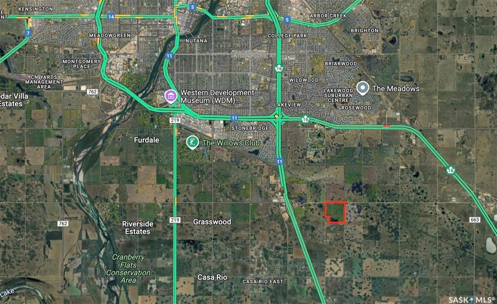 This is a great opportunity for developers or investors looking for a suitable holding property. Located at the corner of Floral Road (TP RD.360) and Prairie View Road on the SE corner of Saskatoon. Purposed Saskatoon Highway route goes past the NW corner of the property.(See pictures for more details.) Land is Soil class "J", sandy loam and currently rented year to year as hay land. Corman Park RM has the land zoned D AG 1. Their website lists several uses for the property, including agricultural activities and other non-agricultural developments, plus many more discretionary uses. (ie. Vet Clinic, Solar Farm, Bulk Fertilizer, etc.) There is a 3 Phase Power Line along the north border and Natural gas line across the property. Call today. Directions: 1 mile east of Grasswood Gas stations on Floral Road.